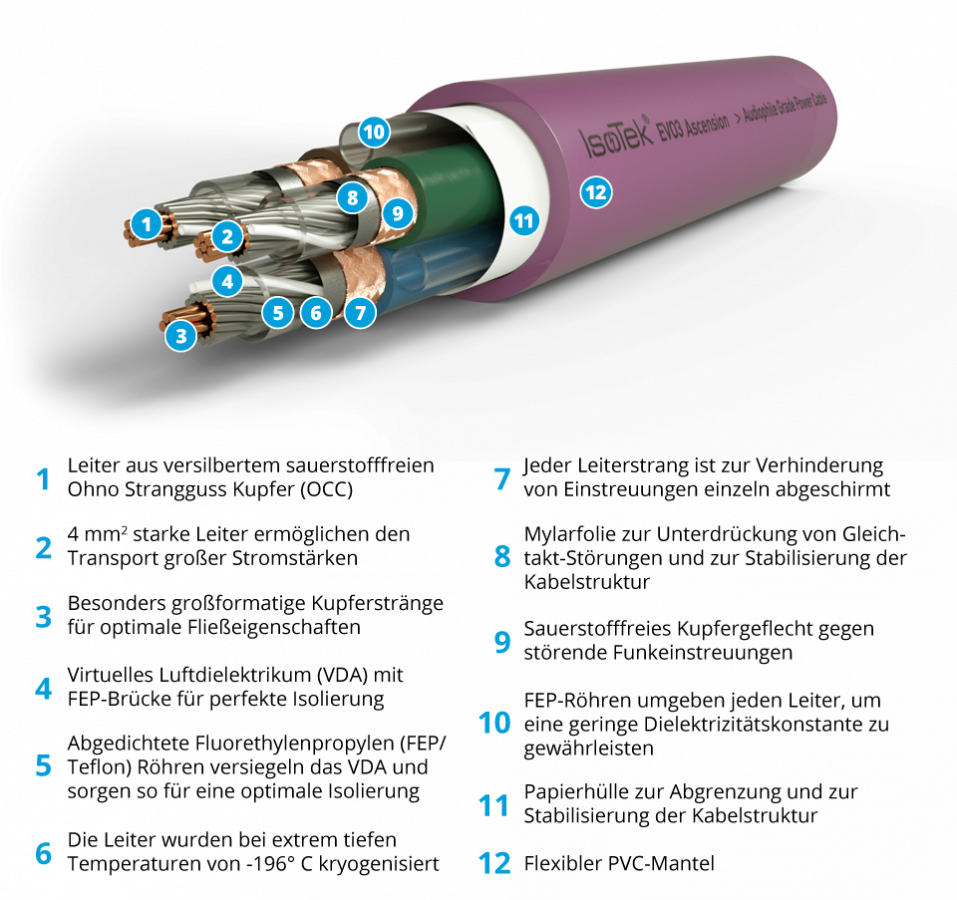 Das EVO3 Ascension besteht aus bei extrem tiefen Temperaturen kryogenisierten versilberten OCC-Kupferleitern (Ohno Strangguss), umgeben von einem Luft-Dielektrikum mit partiellem FEP-Kontakt, bevor eine weitere Hülse aus extrudiertem FEP die Konstruktion umschließt. Jedes dieser einzelnen Leiterbündel ist mit Mylarfolie und einer weiteren OFC-Abschirmung umwickelt und dann leicht mit luftgefüllten FEP-Röhren verdrillt. Das EVO3 Ascension verringert auf diese Weise den Grundrauschpegel auf ein absolutes Minimum und versieht das musikalische Geschehen mit einer holographischen Abbildung, mehr Luft und Raum sowie einer unvergleichlichen Feindynamik.