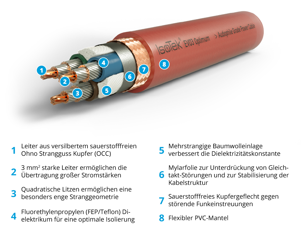 Das IsoTek EVO3 Optimum ist ein überaus aufwändig konzipiertes, exzellentes Netzkabel. Die drei parallel verlaufenden und leicht verdrillten Leiter bestehen aus jeweils 3,0 mm² starken quadratischen und versilberten OCC (Ohno Strangguss) Kupfersträngen. OCC ist ein extrem reines Material, das eine außergewöhnliche elektrische Leitfähigkeit, eine sehr gute Flexibilität sowie Schutz vor Materialermüdung und Korrosion bietet.