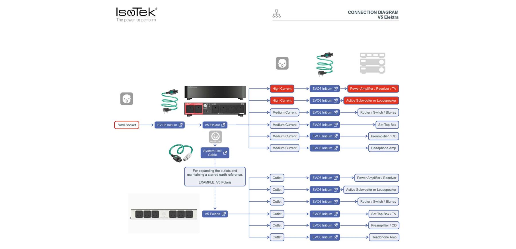 Several IsoTek products feature a System Link outlet, allowing multiple units to be connected in series. This maintains a star earth reference (star grounding) and eliminates the need for multiple wall sockets.